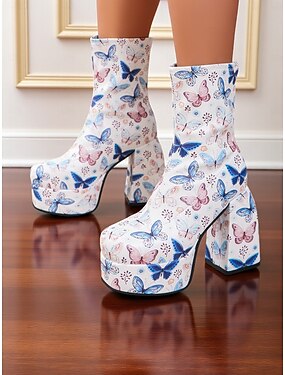 Bottines à talons hauts et plateformes à imprimé papillon pour femmes, en similicuir, à talons épais rétro, chaussures tendance pour le style urbain et les tenues de fête des femmes