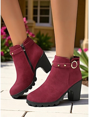 Bottines en simili-daim bordeaux pour femme – bottines tendance à talon épais et bride cloutée pour les tenues d'automne, les fêtes et le shopping