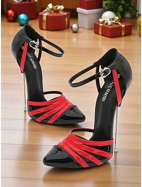 Escarpins à talons aiguilles en cuir verni noir et rouge pour femmes - talons hauts à bout pointu et à lanières pour les soirées et les tenues de club