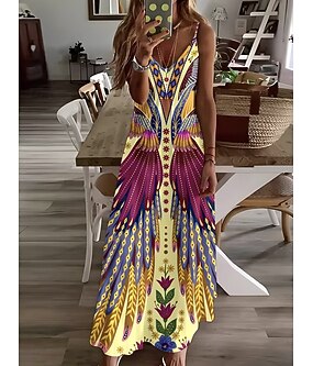 Femmes Robe maxi Robe d'Été Robe trapèze Robe Nuisette Vacances Occasionnel Plage Sortir Coupe régulière Graphique Animal Paisley Sans manches Col en V Jaune Été Printemps