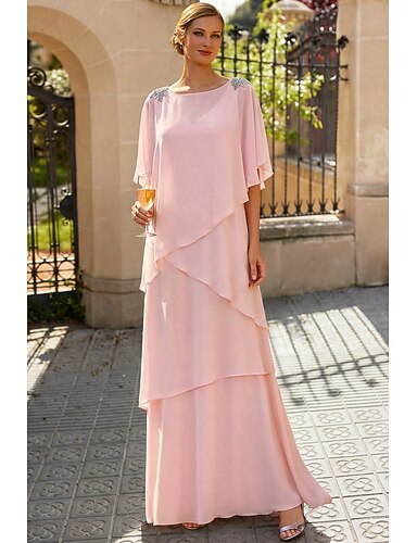 Ligne A Longueur au sol Robe d'invité de mariage Robe de Cérémonie Robe à Volants Robe de Mère de Mariée Demi Manches Bijoux Élégant ancien Simple Formel Chiffon avec Volants Volants en Cascade