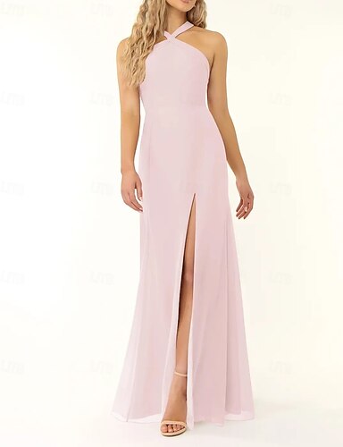 Robe de demoiselle d'honneur en forme de sirène trompette col halter sans manches Élégante longueur sol chiffon avec fente devant