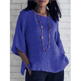 Femmes Chemise Chemisier 100% Coton Couleur Unie Basique Occasionnel Manche 3/4 Col ras du cou Hauts Réguliers Quotidien Bleu Vert herbe Noir Blanche Vert Claire Été