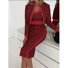 Femmes Robe Ensemble Robe fourreau Élégant Pied-de-poule Imprimé Robe Midi manche longue Col ras du cou Bureau Soirée Bleu Noir Rose Claire Printemps Automne Coupe régulière