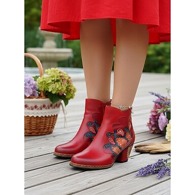 Bottes de cowboy brodées en similicuir rouge pour femme avec motif floral, talon bloc, style western rétro, parfaites pour les festivals, les sorties décontractées et Noël