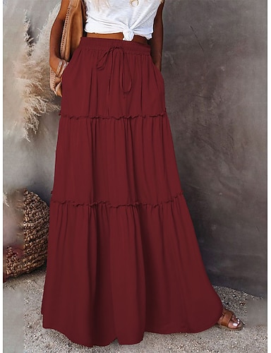 Femmes Taille Asiatique Jupe de vacances Occasionnel Été Maxi Taille haute Jupes Couleur Unie Froncé Plissé Avec Poches Non Elastique Quotidien Vacances Vert pomme Rouge Bleu Roi Vert foncé Été