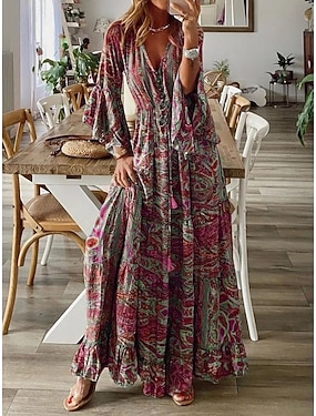Femme Robe longue maxi Robe bohème à manches longues robe boheme Robe imprimée Bohême Mode Vêtement de rue Manches évasées Plein Air Vacances Sortie Ample Graphic Col V Rouge Bleu Violet Orange Et