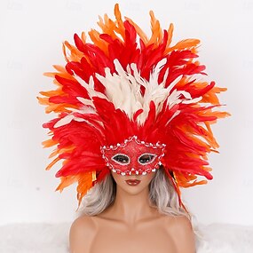 Carnaval 2026 Accessoires de Carnaval de Rio Samba Masque de Carnaval en Plumes Coiffe Masque en Plumes Complètes Rouge Orange et Blanc Costume de Performance au Brésil