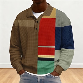 Homme Géométrique Bloc de Couleur Chemises Polo Gaufre manche longue Polos Revers Vêtements de sport Occasionnel École Athleisure Tenue quotidienne Impression 3D Printemps Automne Hiver Bleu Marron