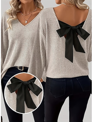 Femmes Pull Élégant Mode Streetwear Couleur Unie Col en V Dos Nu Tricoté manche longue Hauts Réguliers Tricoter Quotidien Extérieur Week-end Rouge vin Noir Printemps Automne