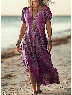 Femmes Robe Longue Maxi Robe Robe Décontractée Robe d'été Robe bohème africain Quotidien Vacances Week-end Coupe régulière Fleuri Manche Courte Col en V Vert Claire Violet Vert Abricot Été
