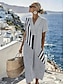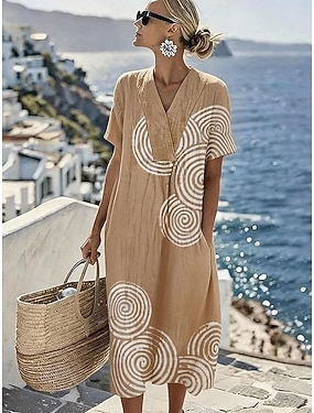 Robe midi pour femmes en lin respirant léger robe d'été robe shift décontractée fête vacances coupe ample géométrique manches longues col en V jaune rose brun clair été printemps
