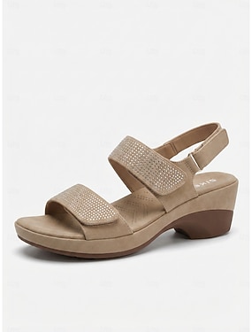 Sandales à talons confortables pour femmes, couleur camel, ornées de strass et dotées de brides réglables – sandales rembourrées avec soutien de la voûte plantaire, idéales pour les voyages, le