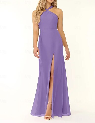 Robe de demoiselle d'honneur en forme de sirène trompette col halter sans manches Élégante longueur sol chiffon avec fente devant