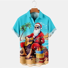 chemise hawaïenne de Noël pour homme, motif Père Noël, décontractée, pour l'extérieur, la rue, décontractée, quotidienne, automne, col cubain, manches courtes, bleu, s m l