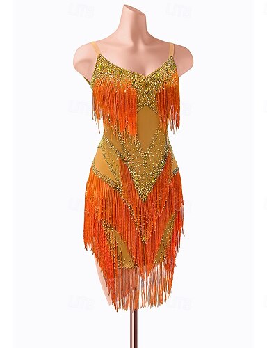 Robe de danse latine orange éblouissante pour femme - décolleté dos nu en cœur avec corsage orné de strass &robe de rumba salsa cha-cha à franges amples