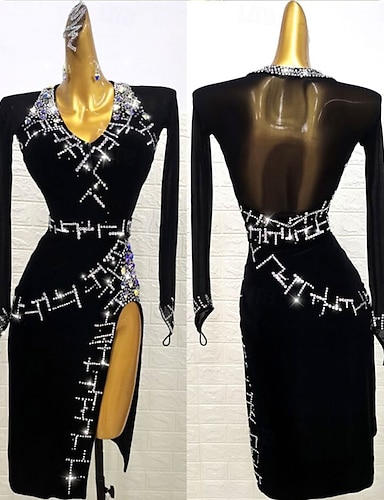 Danse salsa robe de danse latine perles cristaux / strass paillettes performance femme manches longues maille chinlon