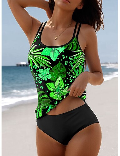 Femmes Maillots de Bain Tankini 2 pièces Coquin Maillot de bain Dos nu Vacances Tenues de plage A Ombre Fleuri Col en U Sans manches Maillots de bain