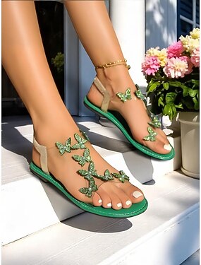 sandales à bride en T ornées de strass verts pour femmes avec bride élastique à la cheville – chaussures d'été élégantes pour la plage, les fêtes ou les tenues décontractées