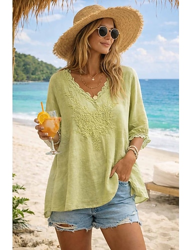Femmes Chemise Chemises en coton et lin Chemisier Broderie Couleur Unie Mode Occasionnel Col rond Quotidien Rue Blanche Jaune Rouge Vert Kaki Été