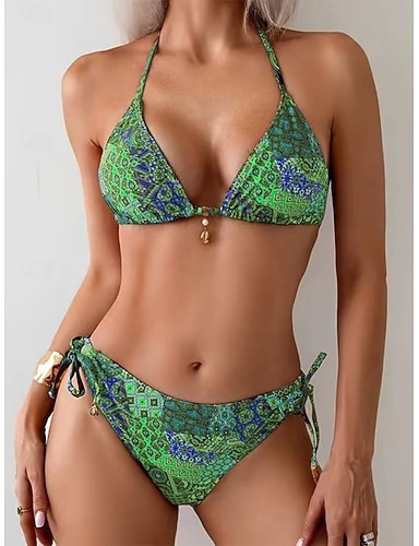 Maillot de bain femme 2 pièces bikini échancré halter vintage sexy graphique géométrique décolleté plongeant sans manches