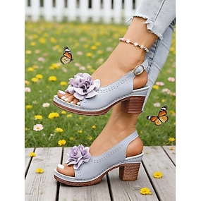 Sandales à talons moyens pour femmes, ornées de fleurs grises – style élégant et décontracté, talon bloc confortable, idéales au quotidien, pour les garden-parties, les voyages et les événements estivaux.