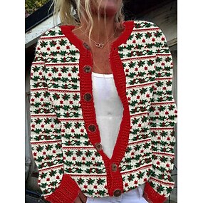 Femmes Cardigan Quotidien Élégant Fleuri Graphique Bonhomme de neige Côtelé Col ras du cou Col en V Boutons Imprimé manche longue Hauts Réguliers Tricoter Extérieur Week-end Rose Claire Rouge Automne