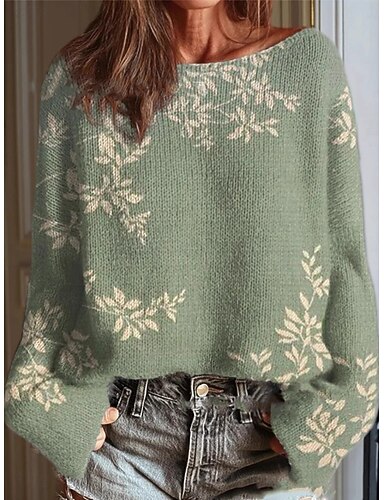 Femmes Pull Vacances Quotidien Occasionnel Fleuri Côtelé Col ras du cou Imprimé manche longue Hauts Réguliers Tricoter Extérieur Quotidien Fête Blanche Vert Automne Hiver