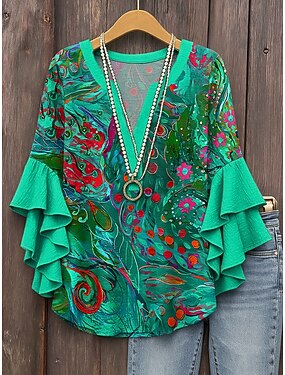 Blouse rétro femme à volants superposés Tops vintage graphique floral paisley Bohémien vintage quotidienne manches 3/4 régulières tops vêtements de vacances Print Blanc Rouge Bleu Vert
