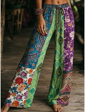 Femmes Jambe large Pantalons Vacances Mode Boho Longueur complète Taille Moyenne Fleuri Paisley Cordon de serrage Avec Poches Taille Élastique Confortable Respirabilité Non Elastique Quotidien