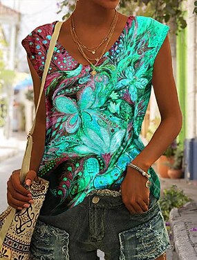 Débardeur Caraco Femme Imprimé Floral Basique Sans Manches Tops Réguliers Col V Casual Vacances Rouge Bleu Orange Vert