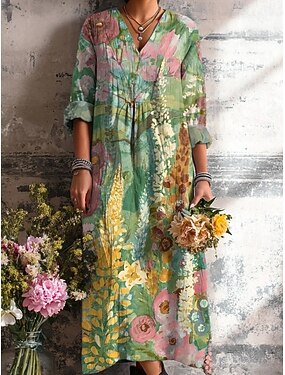 Robe Midi Femme Robe Boho Robe A Ligne Vacances Casual Quotidien Coupe Légère Graphique Florale Manches Longues Col V Bleu Rouge Vert Printemps Automne