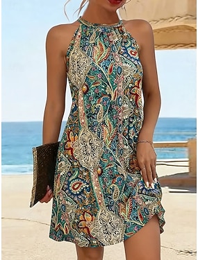 Femmes Robe Longueur Genou Robe trapèze Robe d'été Vacances Occasionnel Coupe régulière Graphique Motif cachemire damassé bohème Sans manches Col Halter Jaune Rouge Orange Vert Été Printemps