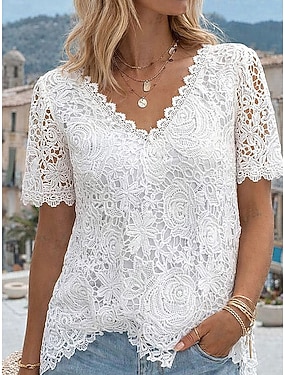 Femmes Chemisier Dentelle Couleur Unie Élégant Quotidien Occasionnel Manche Courte Col en V Hauts Réguliers Quotidien Fête Sortir Bleu Blanche Rose Claire Vin Été Printemps