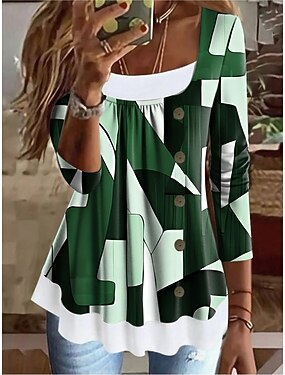 Femmes T-shirt Graphique Géométrique ancien Élégant Classique manche longue Col carré Hauts Réguliers Quotidien Week-end Patchwork Boutons Imprimé Noir Rouge Bleu Vert Printemps Automne Hiver