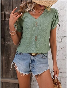 Femmes Chemisier Couleur Unie Élégant Occasionnel Manche Courte Col en V Hauts Réguliers Quotidien Blanche Vert Abricot Été Printemps