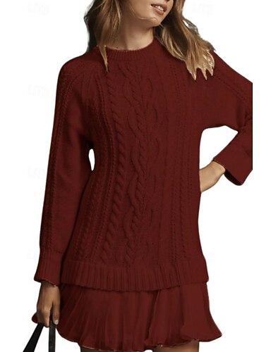 Femmes Robe pull Élégant Occasionnel Doux Couleur Unie Côtelé Col ras du cou Tricoté manche longue Hauts Longs Tricoter Extérieur Quotidien Week-end Noir Vin Automne Hiver
