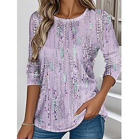 T-shirt femme à manches longues col rond tunique graphique géométrique abstrait élégant vintage chic tops réguliers impression quotidienne rose bleu violet vert préautomne