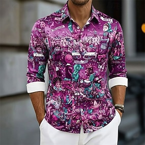 Mardi Gras Homme Carnaval Perles Masque à plumes Chemise Chemise Boutonnée manche longue Vintage Rétro Fête Été Printemps Col Rabattu Impression 3D Chemise en lin Violet Vert