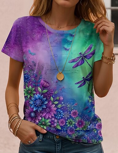 T-shirt pour femmes floral col rond à manches courtes impression 3D de papillons élégante décontractée confort_fit violet mult taille haut de mode