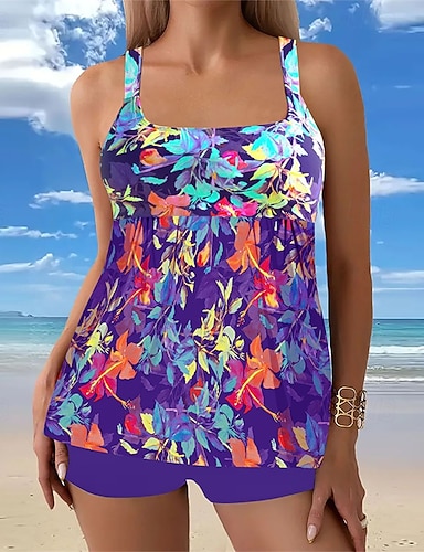 Femme Tankini Maillot De Bain Deux Pièces Maillots de Bain Floral Maillots de Bain Noir Bleu Respirable Séchage rapide Poids Léger Sans Manches - Natation Surf Plage Eté Printemps Grande Taille