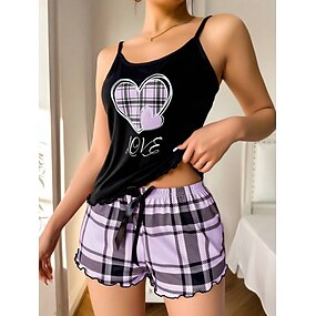 Femmes Ensemble Pyjama Occasionnel Confort Cœur Grille / Carreaux Taille Élastique Débardeur Shorts Quotidien Maison Sans manches Col ras du cou Violet Été Printemps Coupe régulière