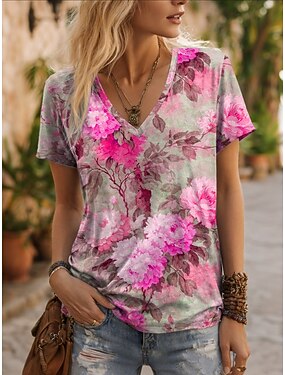 Femmes T-shirt Imprimé Fleuri Graphique ancien Élégant Occasionnel Manche Courte Col en V Hauts Réguliers Quotidien Bleu Rose Claire Violet Été Printemps