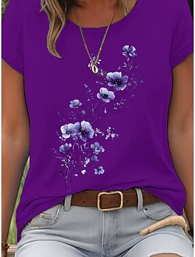 Femmes T-shirt Imprimé Fleuri Bloc de Couleur 3D Élégant Occasionnel Manche Courte Col rond Hauts Réguliers Quotidien Week-end Violet Été Printemps
