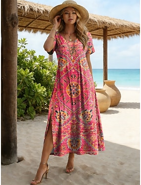 Femmes Robe Midi Robe trapèze Vacances Occasionnel Boho Coupe régulière Graphique Géométrique Manche Courte Col en V Bleu Rouge Violet Vert Été Printemps