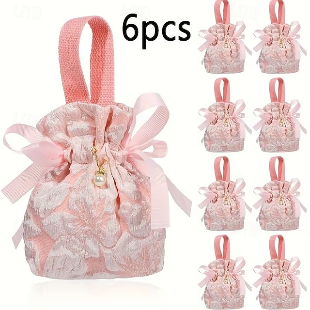 Lot de 6 élégants sacs cadeaux à cordon coulissant, à motif floral et poignées - rose pâle - parfaits pour les mariages, anniversaires, fêtes prénatales - fermeture sécurisée - idéaux pour les cadeaux #10167219