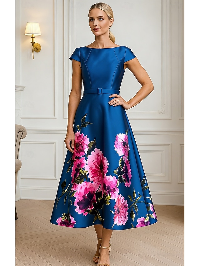 Ligne A Longueur thé Robes de Cocktail Robes de soirée Élégant Manche Courte Col Bateau Fête de jardin Mariage Satin avec Imprimé floral