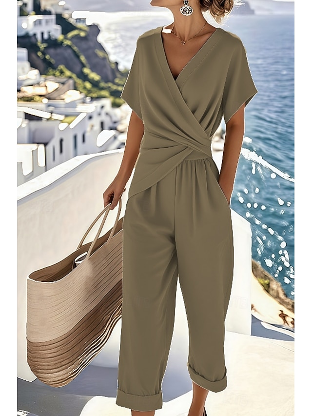 Femmes Ensembles de Pantalons Haut boléro Manche Courte Col en V Couleur Unie Froncé Mode Streetwear Occasionnel Quotidien Extérieur Bleu Kaki Beige Été Coupe régulière #12945622
