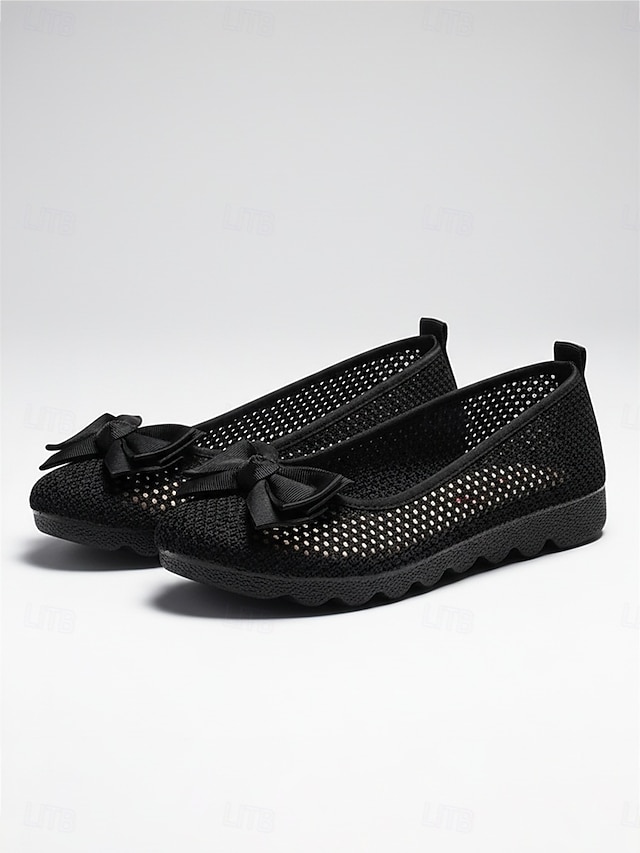 Ballerines noires en maille pour femme, respirantes, ornées d'un nœud décoratif, à enfiler, confortables et décontractées, idéales pour le bureau et le quotidien. & été #13083030