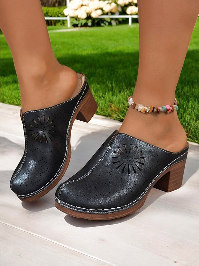 Chaussures mules à talon carré perforé pour femme – style rétro chic pour les garden-parties, les promenades décontractées et les loisirs en plein air #14050352